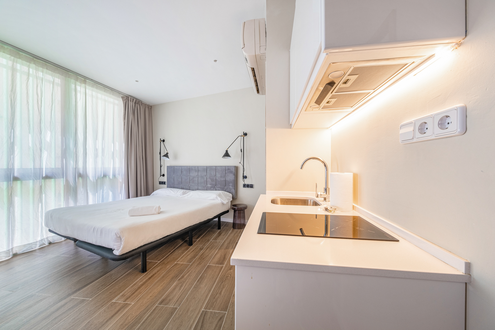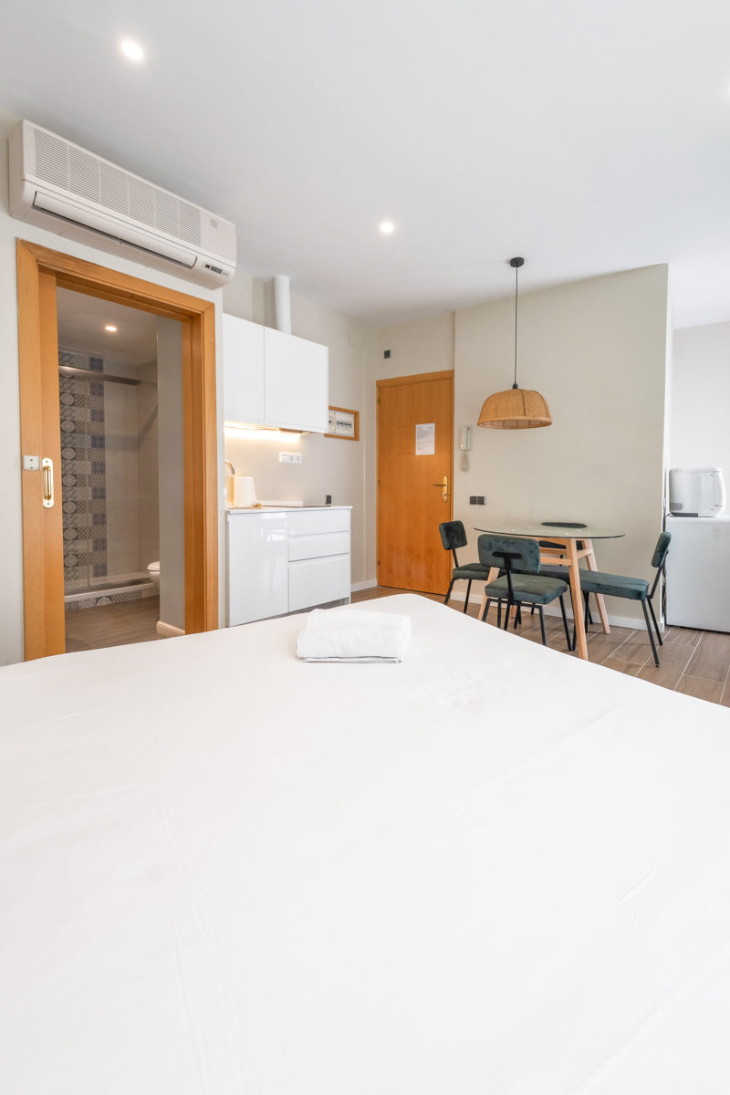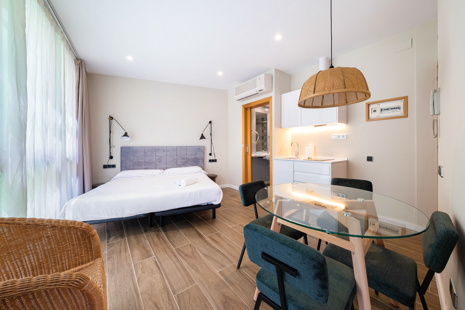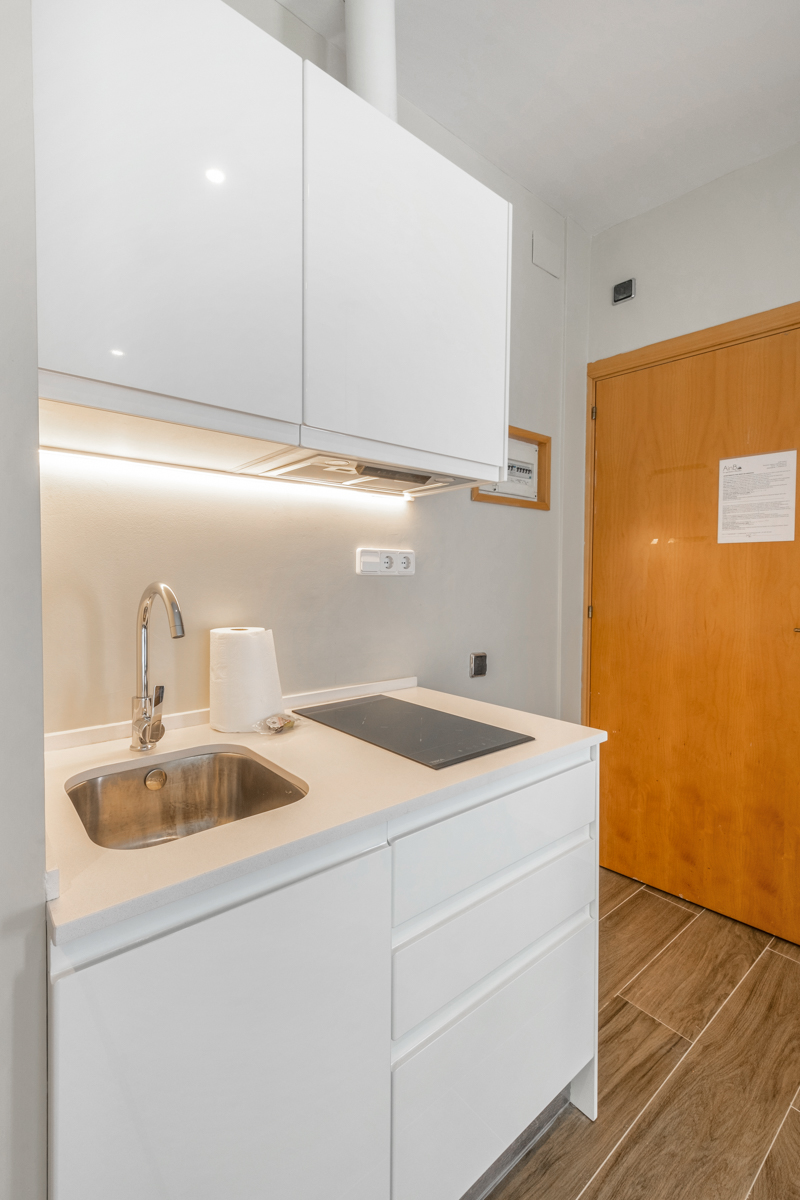 Este moderno estudio en alquiler tiene una cocina básica, 1 cuarto de baño y un pequeño balcón. Con una superficie de 35 m2, el piso es pequeño, pero está perfectamente equipado para dar cabida a una sola persona o una pareja. Mobiliario proporcionados incluyen 2 camas individuales, un televisor, 1 sofá y una mesa de comedor con 2 sillas.