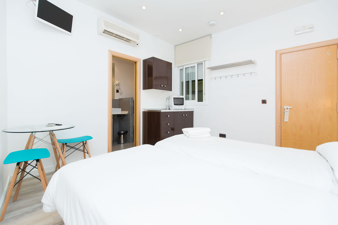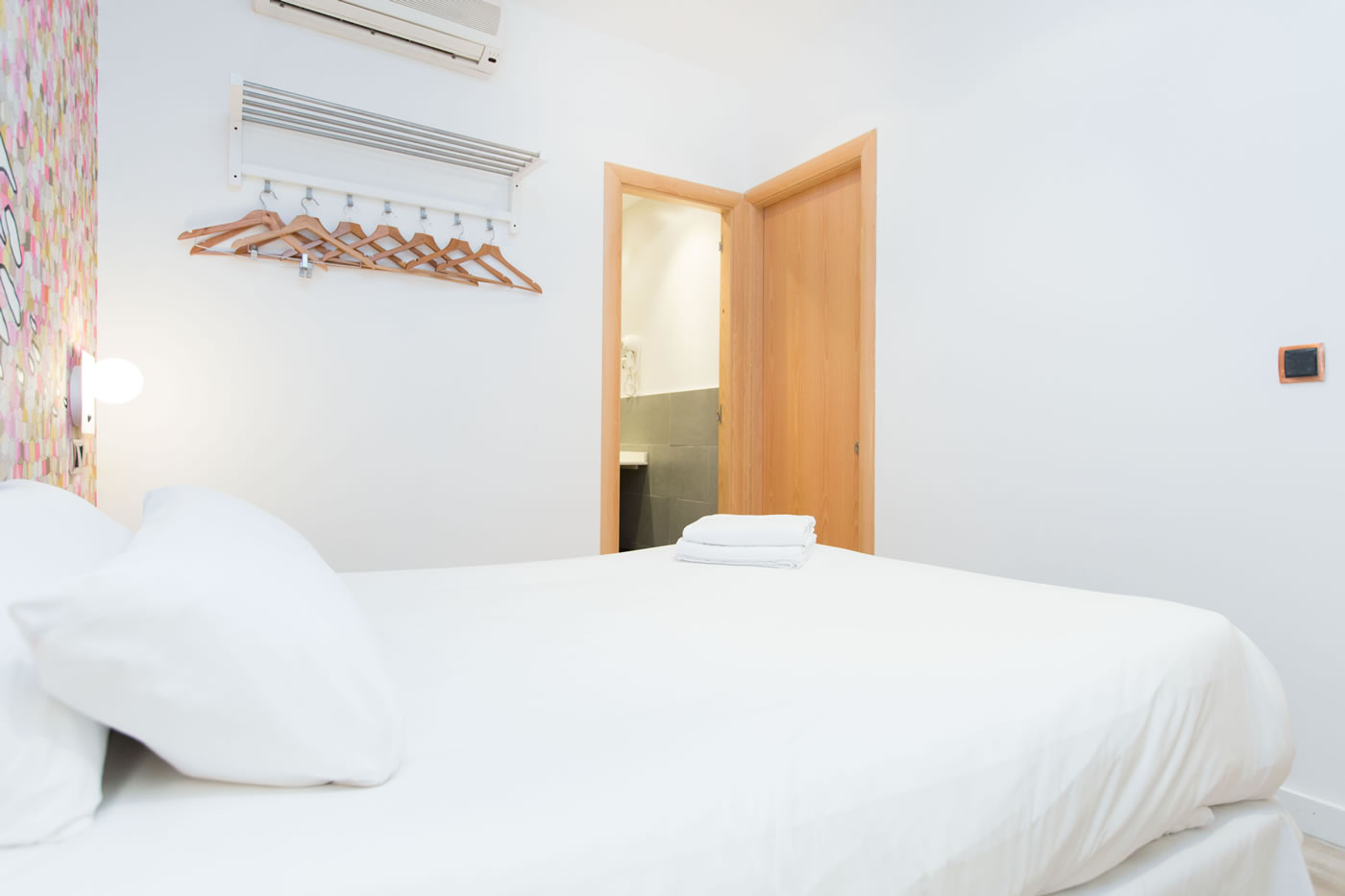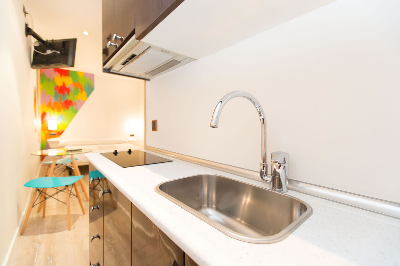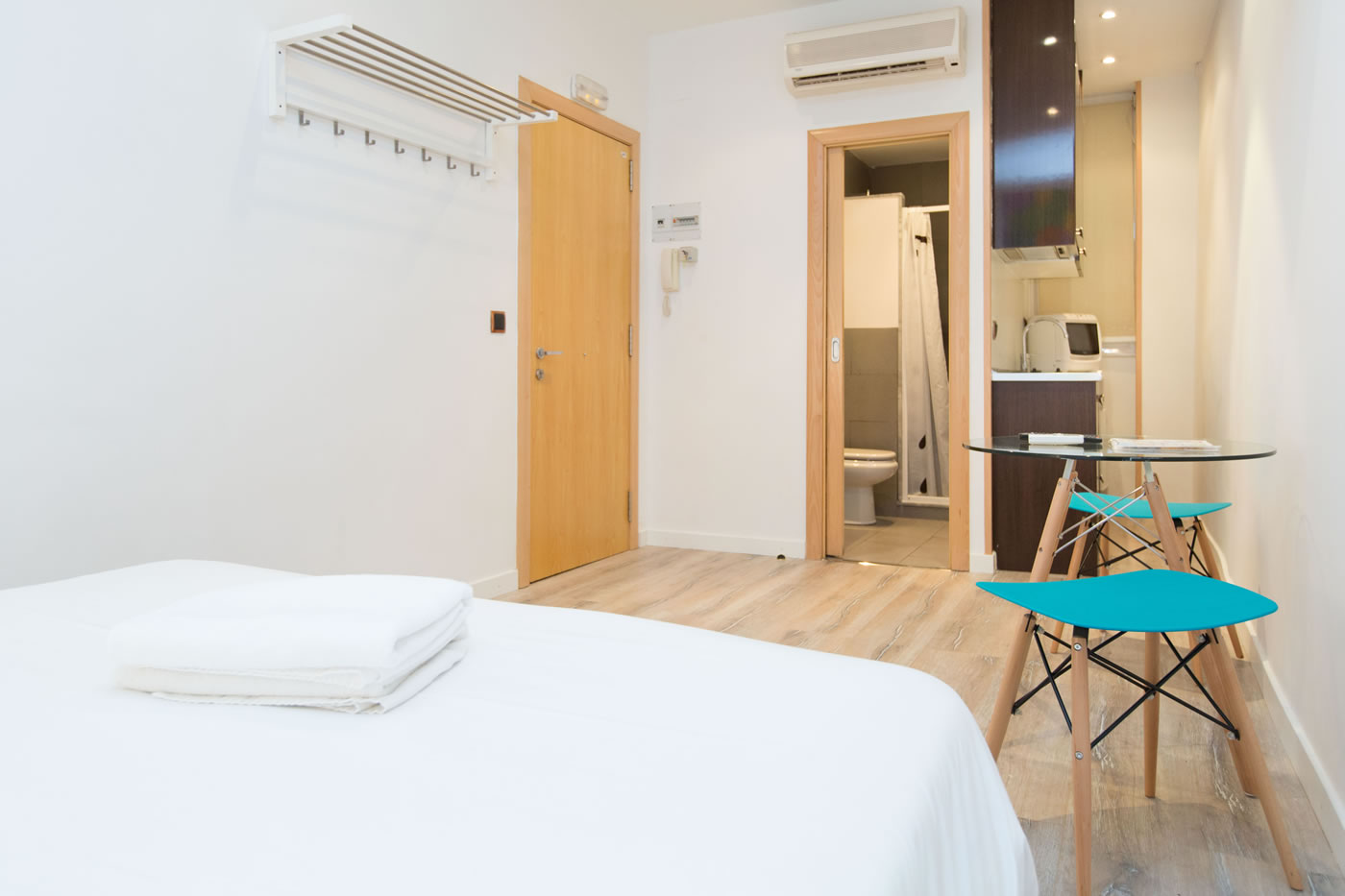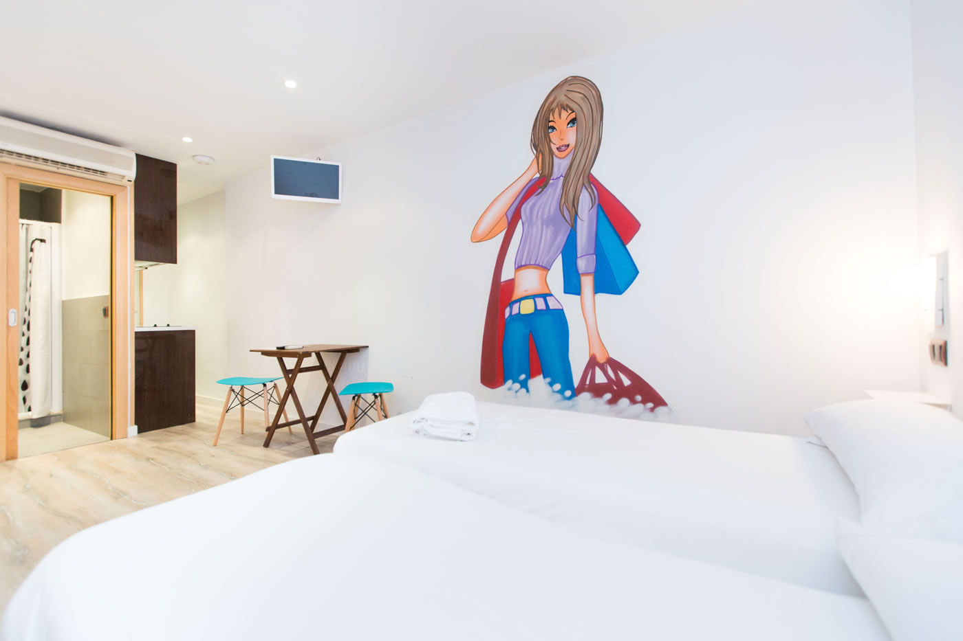 In just 25m2, you can find everything you need to be happy in Barcelona: a comfortable double bed, a small living area, a functional kitchen and a modern bathroom with a shower. The contrast between the attention-grabbing pop illustration on the wall and warm parquet floor offer a relaxed and comfortable atmosphere.