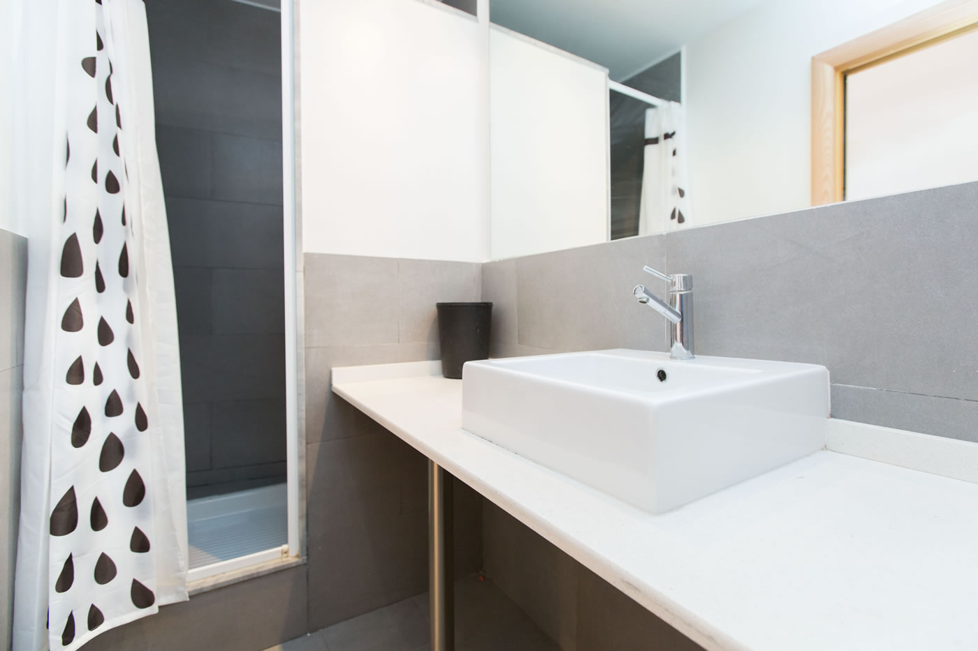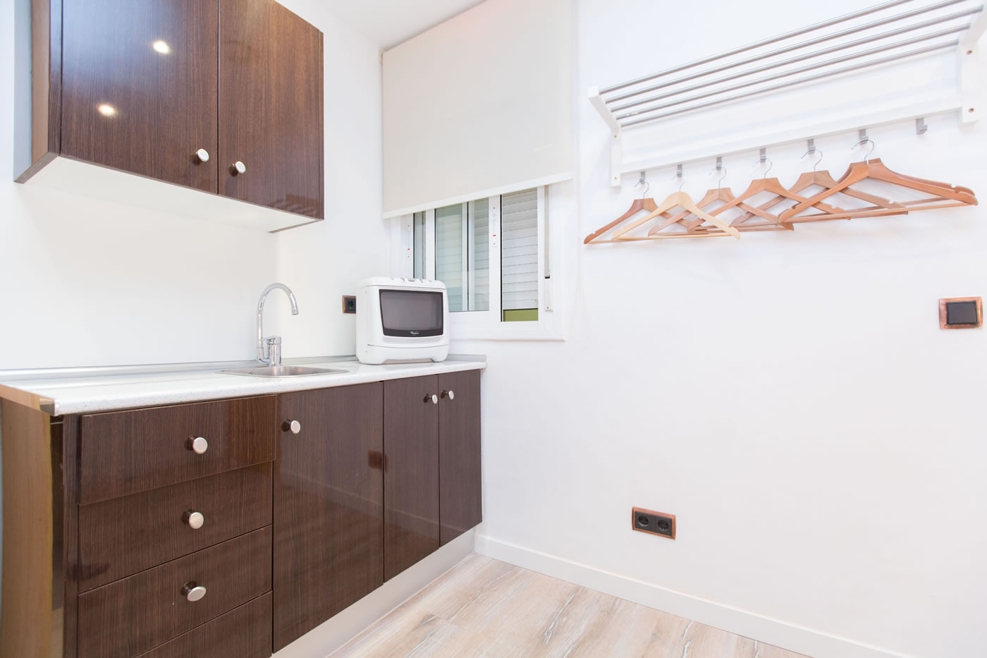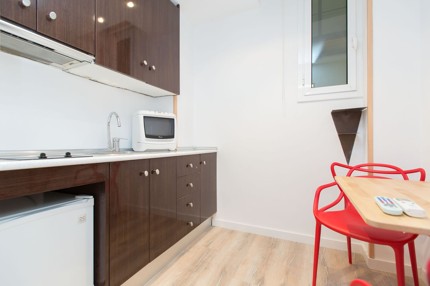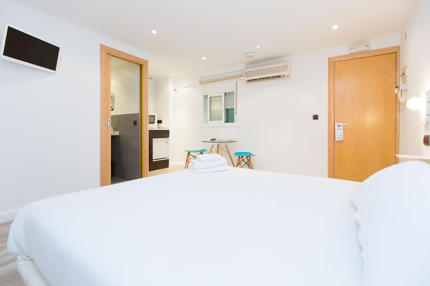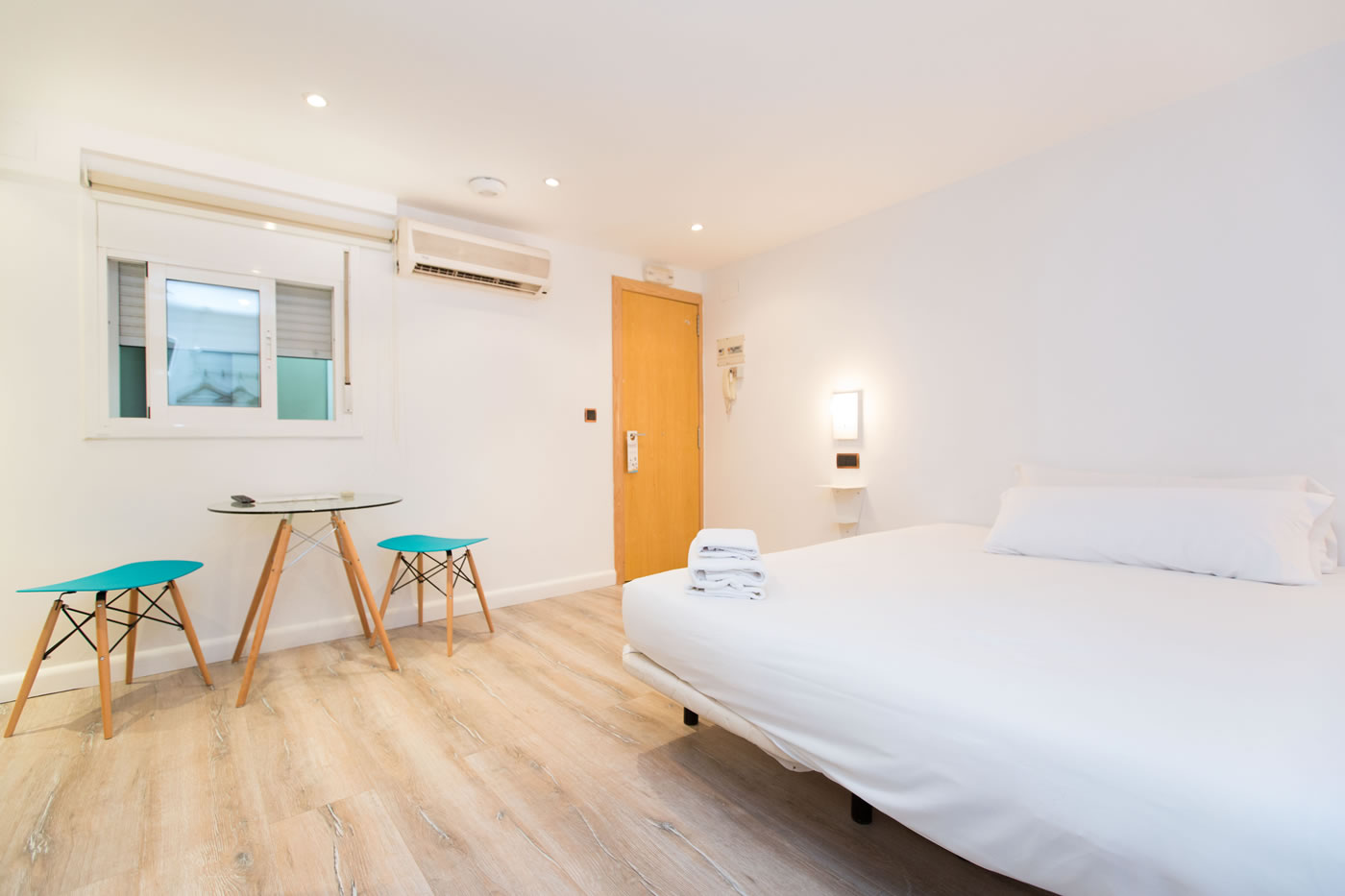 In just 25m2, you can find everything you need to be happy in Barcelona: a comfortable double bed, a small living area, a functional kitchen and a modern bathroom with a shower. The contrast between the attention-grabbing pop illustration on the wall and warm parquet floor offer a relaxed and comfortable atmosphere.