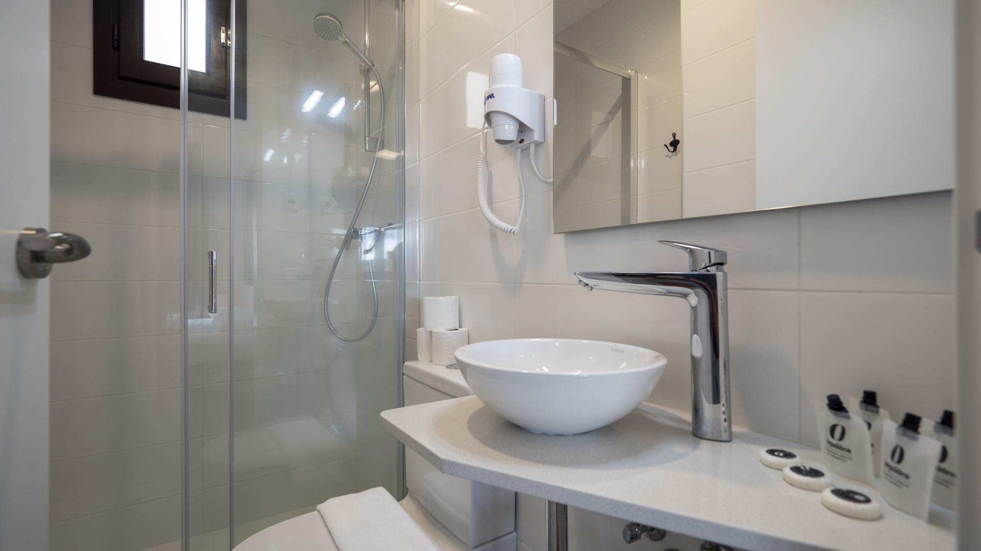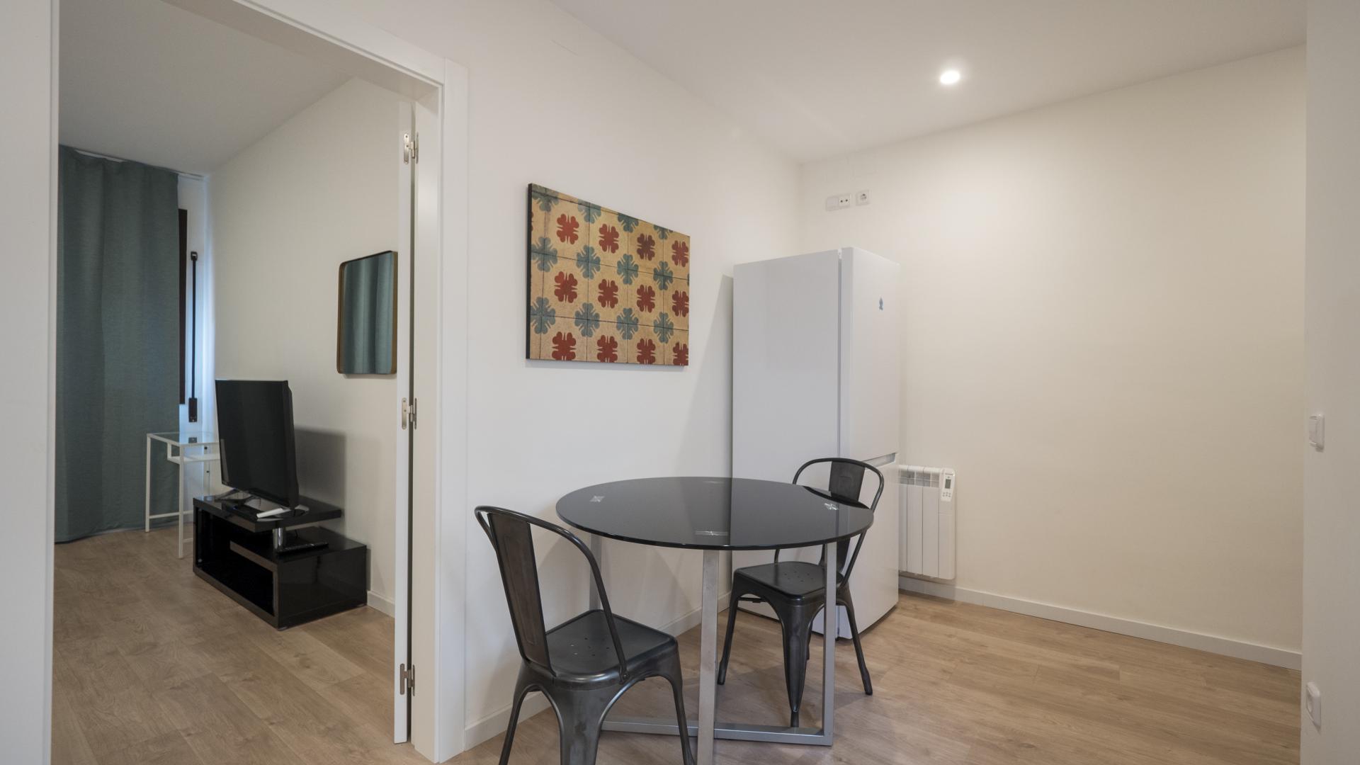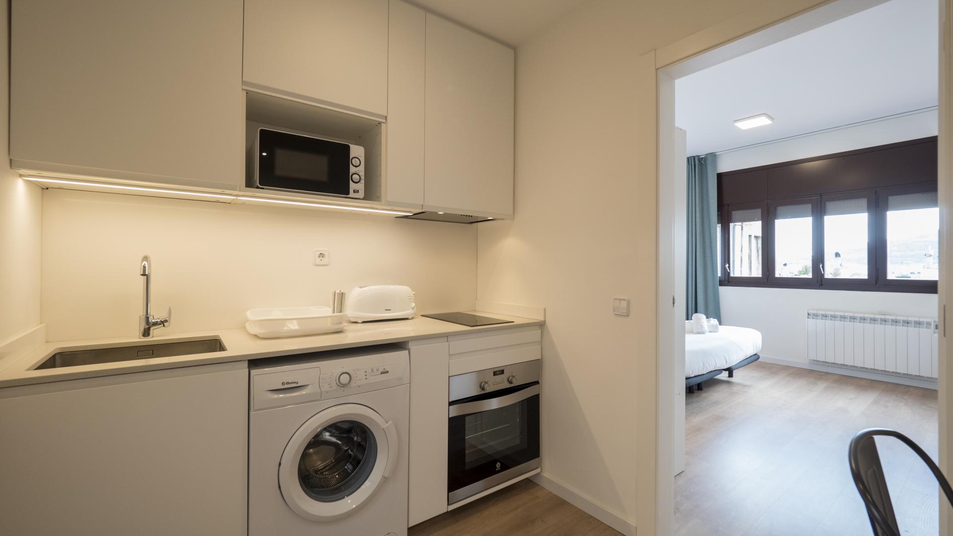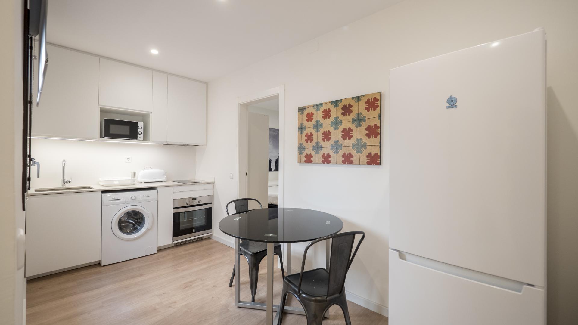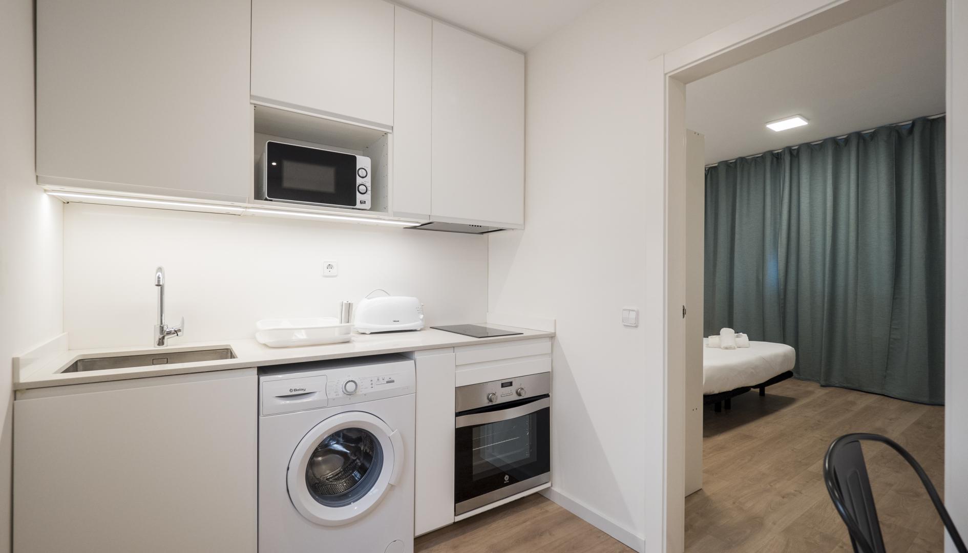 The apartment has a space where the double bed and a television are located and another area where there is a full equipped kitchen and dinning area. The kitchen is fully equipped with oven, microwave, refrigerator and freezer and induction hob.