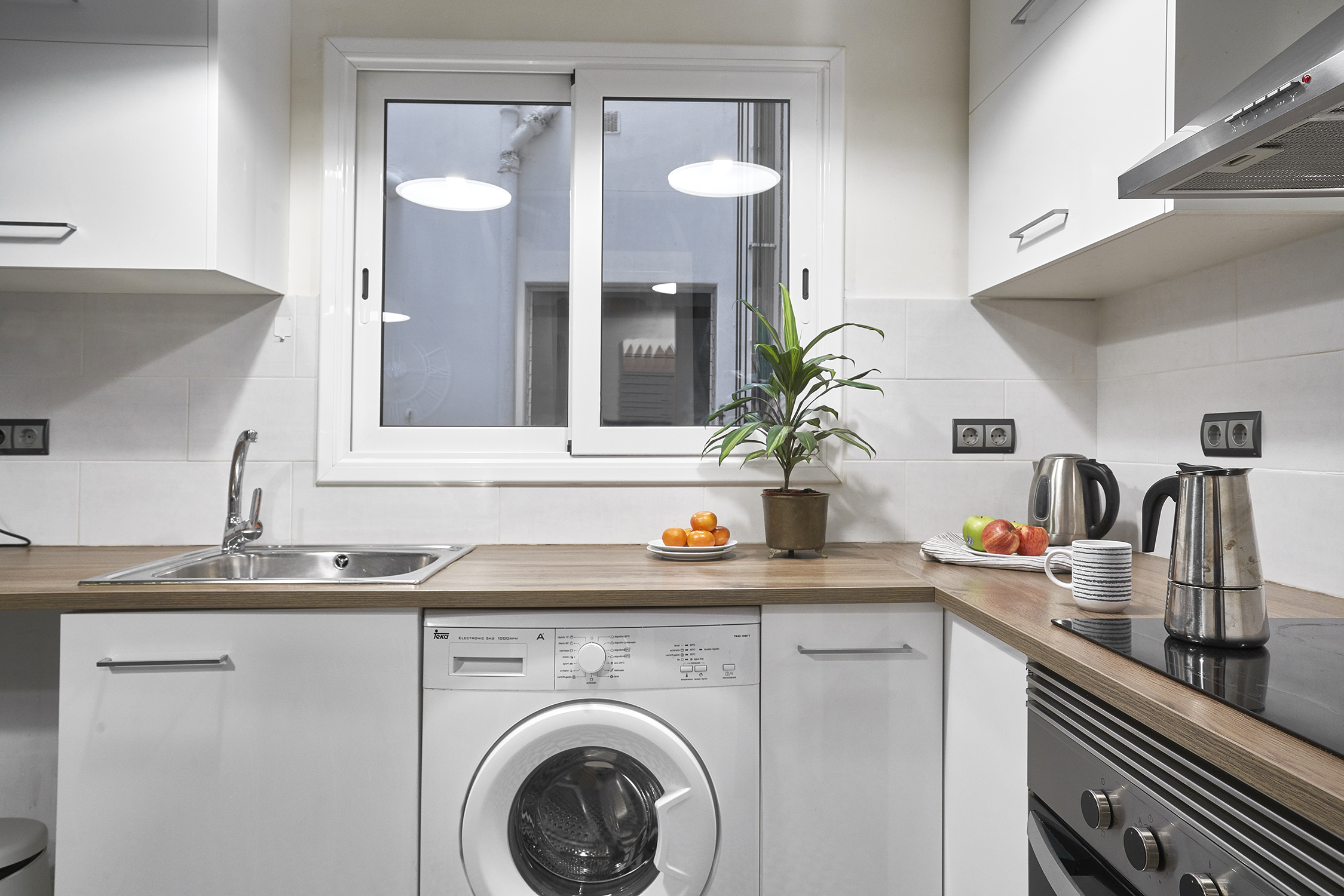 The large kitchen includes everything you need to make your stay a comfortable and simple experience: washing machine, fridge, oven, microwave, coffee maker, as well as cutlery and kitchenware. Also, it has a full bathroom with a shower tray that includes towels, and a half bathroom without a shower. It has air conditioning and free Wi-Fi. We manage several studios in the same building with the same characteristics, typology and decoration.