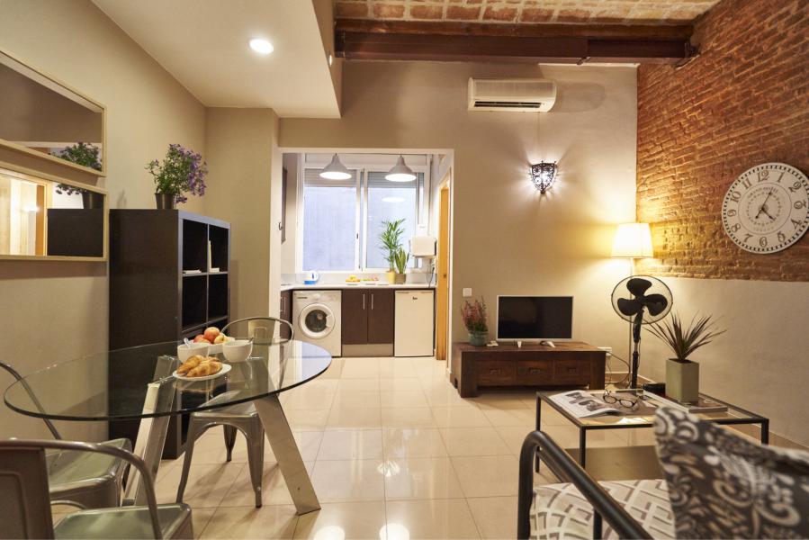 These cozy and spacious apartments, located in the heart of the Barrio de Gracia, are fully equipped and ready to move into. The apartments have a living room covered by a rustic brick wall, which gives character and warmth to the apartment. Also, it communicates with the dining room, creating a spacious and pleasant environment to share with friends and family.